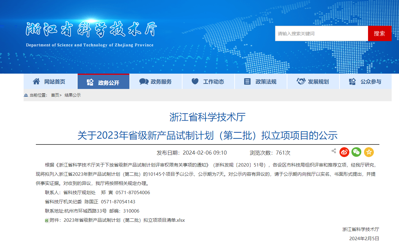 浙江省科学技术厅关于2023年省级新产品试制计划(第一批)拟立项项目的公示